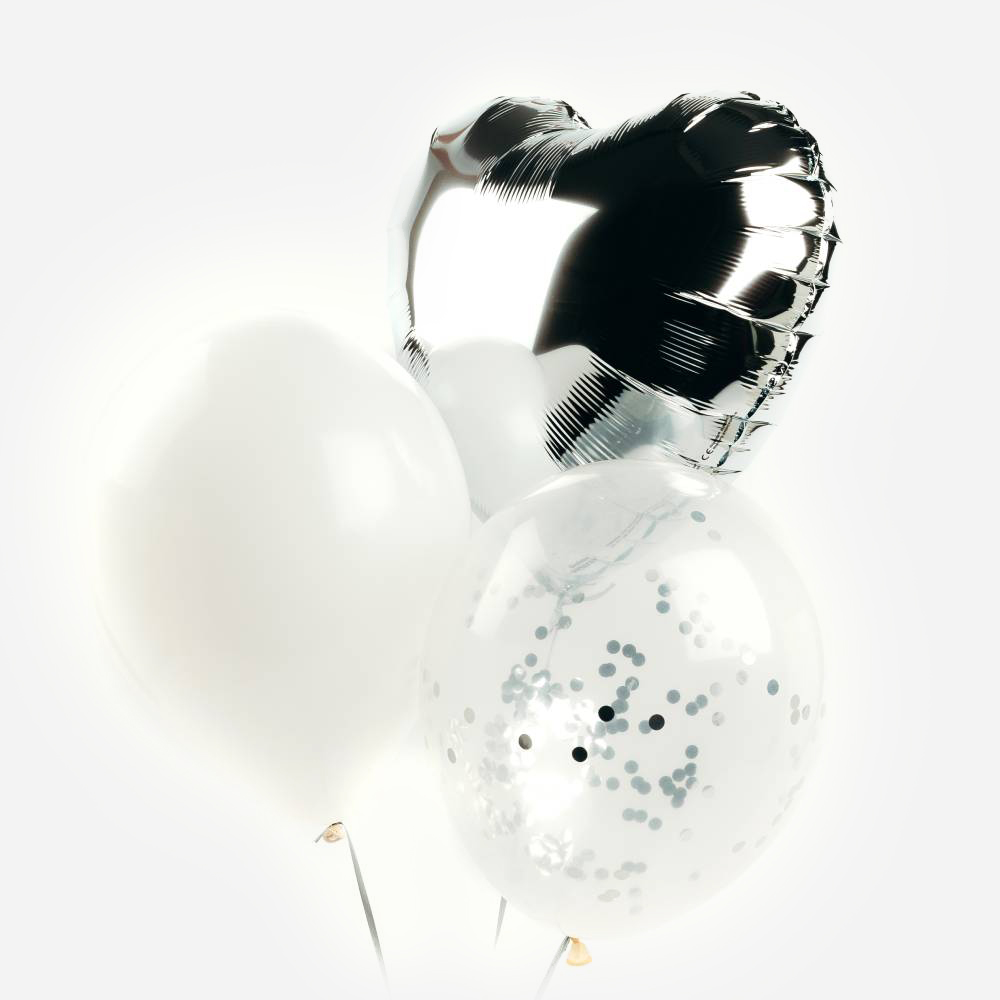 Add the finishing touch to your gift with a set of helium-filled balloons. Including a silver 18″ heart-shaped foil balloon, silver confetti balloon and one white balloon in each group of three.