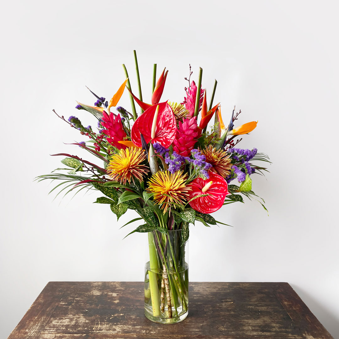 Picture a tall, clear glass vase filled with an explosion of colours and textures. This epic tall vase arrangement is a blend of bird of paradise, ginger flower, heliconia and anthurium. Nestled among the tropical florals are palm leaves and Florida Beauty that add an air of wild elegance.