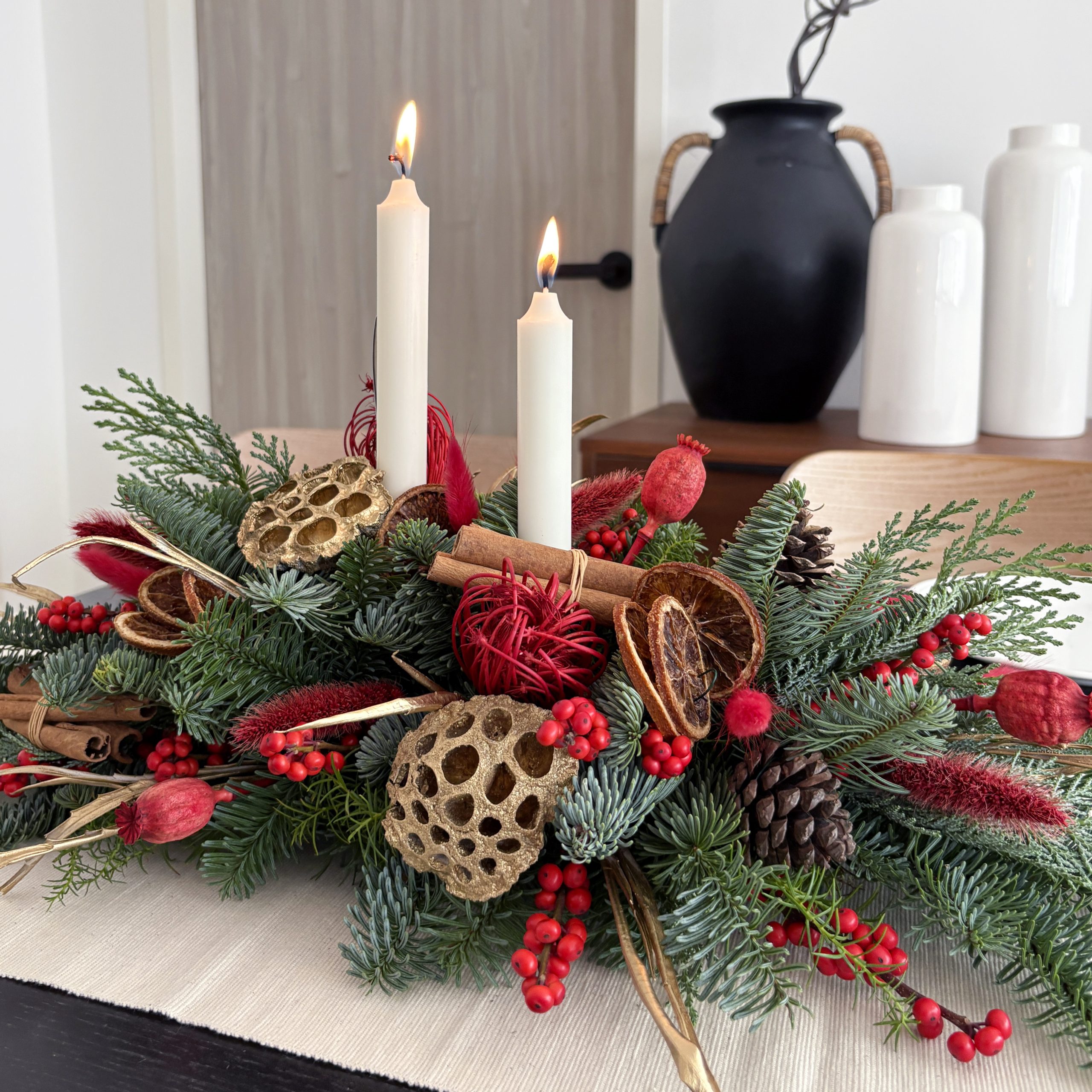 Deck your table this Christmas with our scented table garland. Bursting with European pine cones, cinnamon sticks, pine leaves, lotus pod and berries, it adds a warm, festive touch to your dining table or mantel, filling your home with the cozy scent of the holidays.