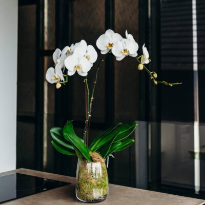 This captivating Phalaenopsis Orchid is the epitome of refined beauty and is suitable as a gift or for enjoying it in your own home. Elegantly potted with moss in a 18cm tall tapered glass vase.