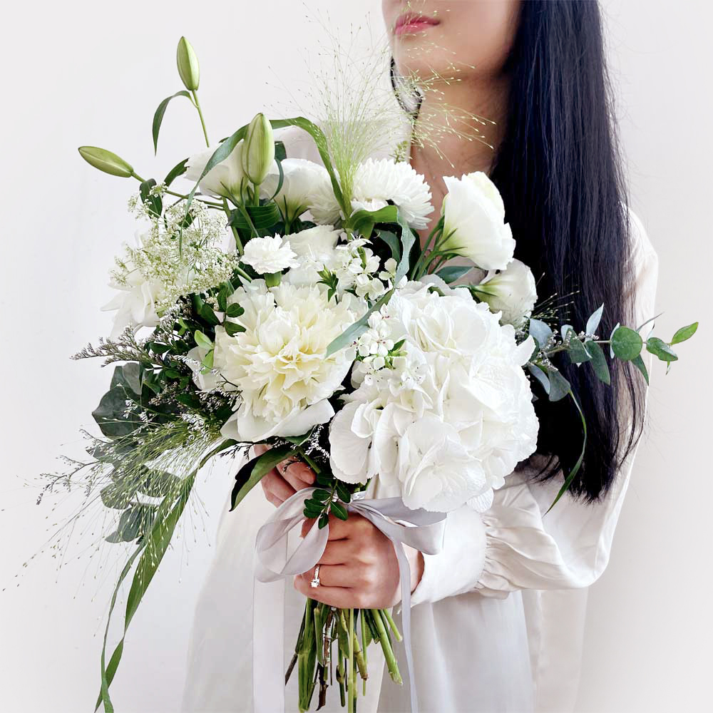 Your choice of colour with accent textures, greenery and satin ribbon arranged in a hand bouquet. Available in three sizes, most appropriate for the bride (Standard), bridesmaids (Small) and flower girls (Petite). Bridal bouquet features only premium blooms to ensure beautiful photos from all angles.