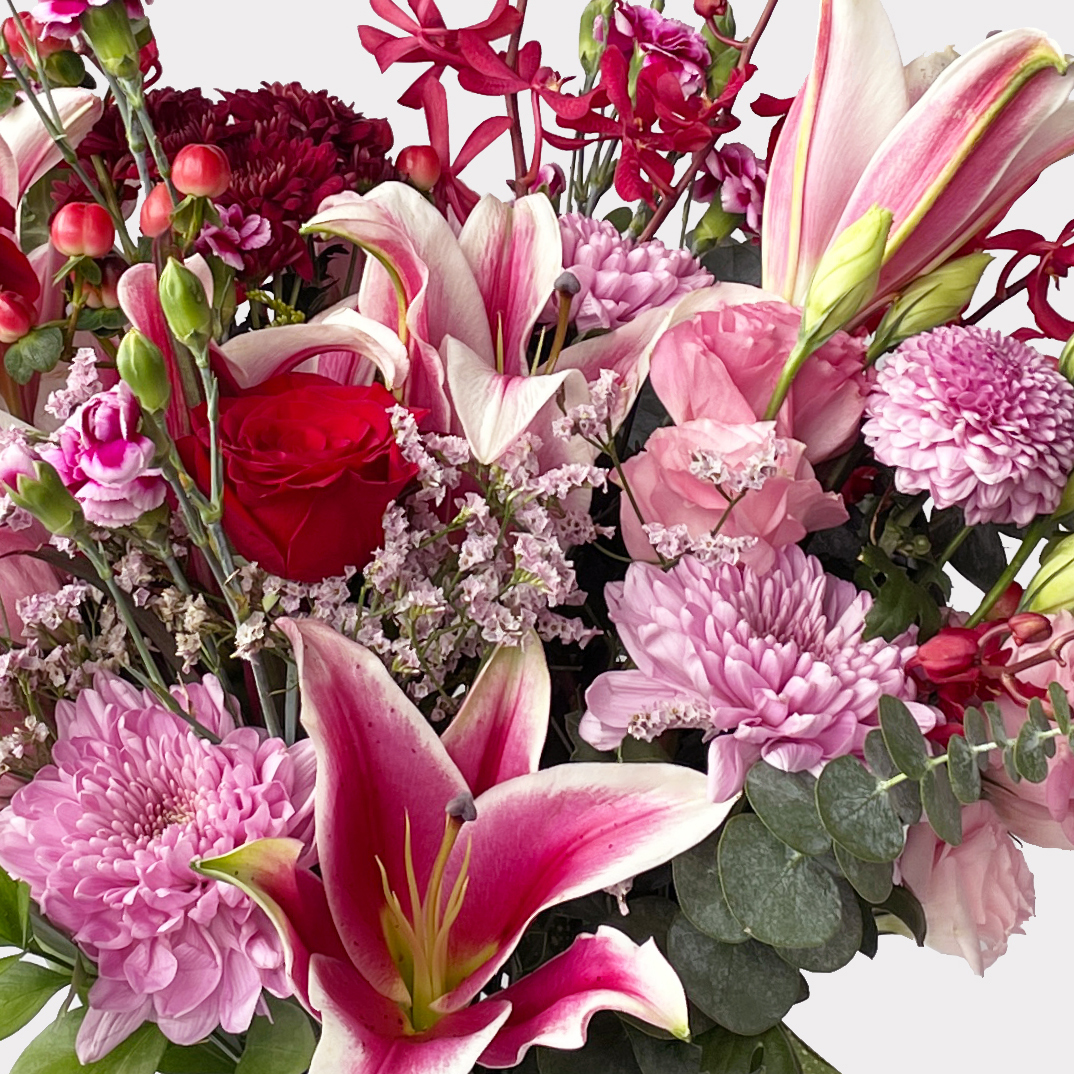 For romance, celebrations or just because, express ‘I love you,’ ‘Congratulations,’ or ‘Thinking of you’ with Red Velvet – a beautiful blend of red roses, pink lilies and velvety blooms. Send it to someone special at any time, for any occasion.