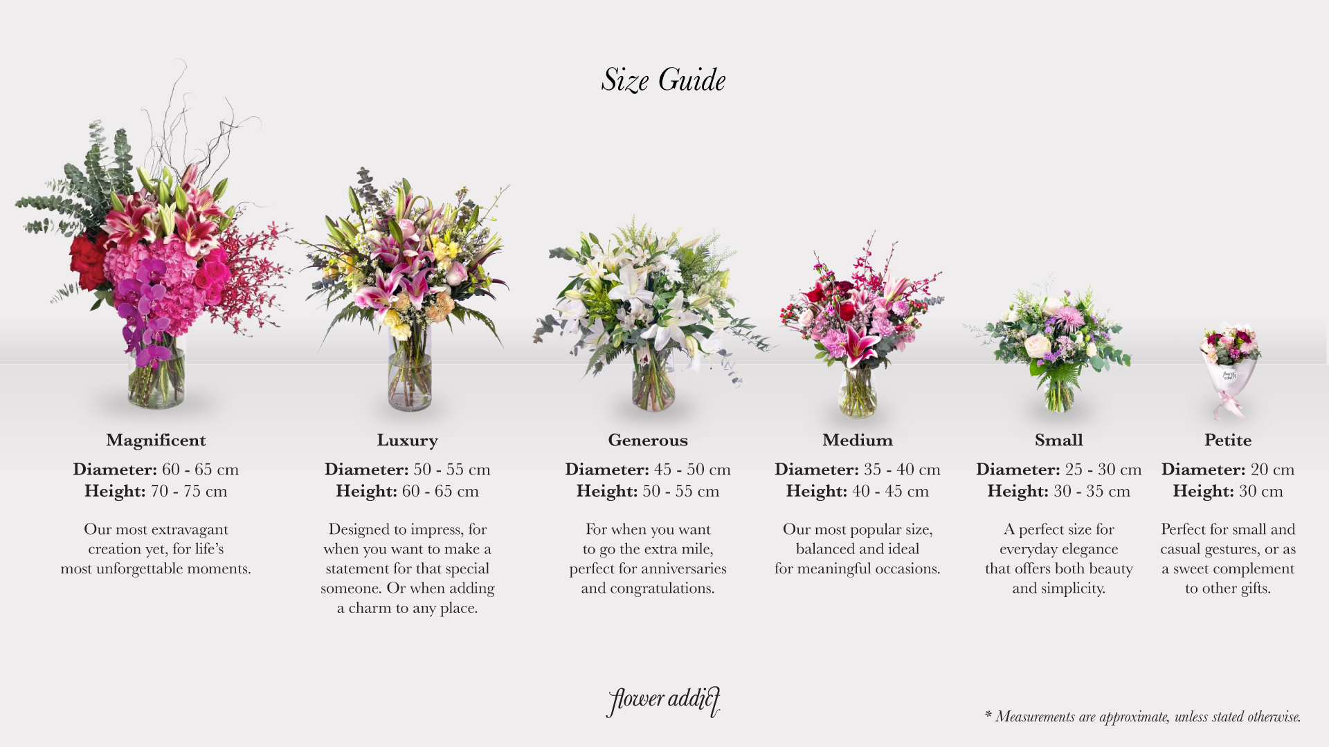Not sure which bouquet size is right for your occasion? Explore our guide from Petite to Magnificent sizes and discover the perfect arrangement for your space and celebration. All measurements are approximate, unless otherwise stated.