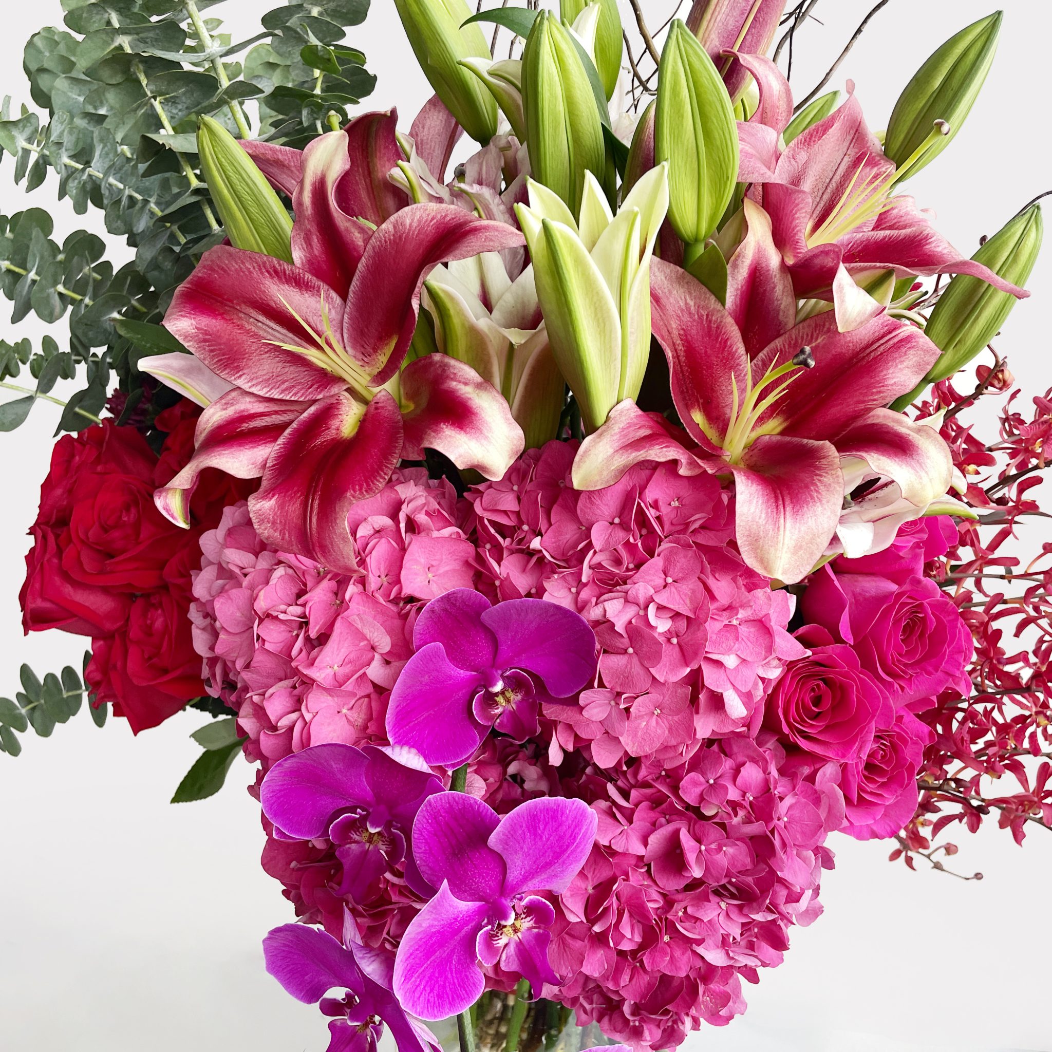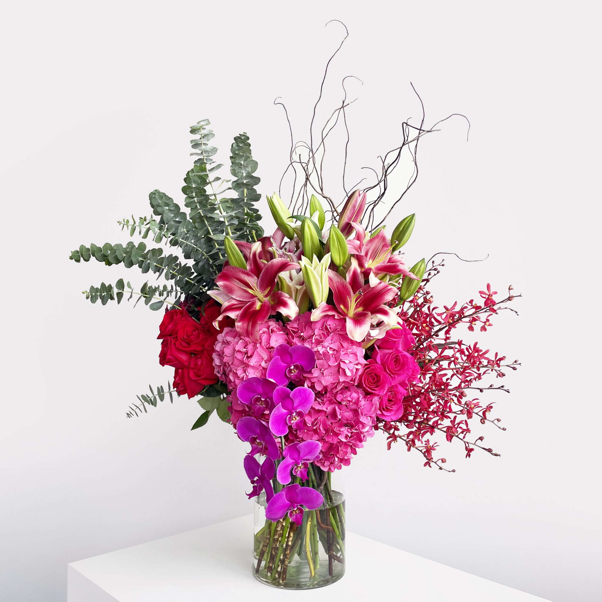 We are rolling out the red carpet for the Hollywood arrangement! Picture the curtains rising, and the spotlight on this magnificent showstopper – an all-star cast of premium roses, hydrangeas, lilies and our leading lady, a grand phalaenopsis orchid. Whatever the occasion, Hollywood turns every moment into a scene-stealer, making anyone feel like a star.