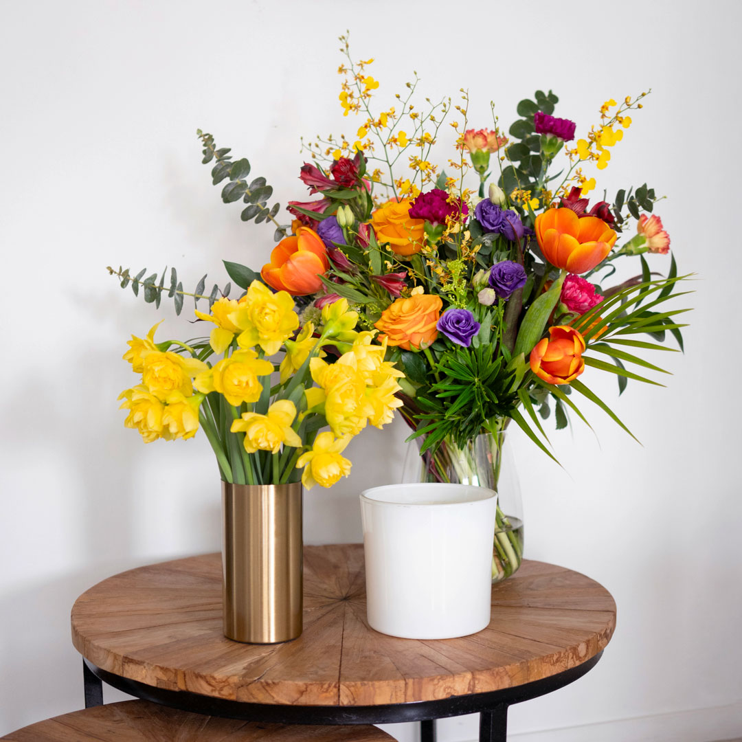 This kaleidoscope of colour will create a great impression and brighten up your day. Bursting with spring colours, this bubbly arrangement gives you reason to celebrate. Includes tulips, alstroemeria and eustoma.
