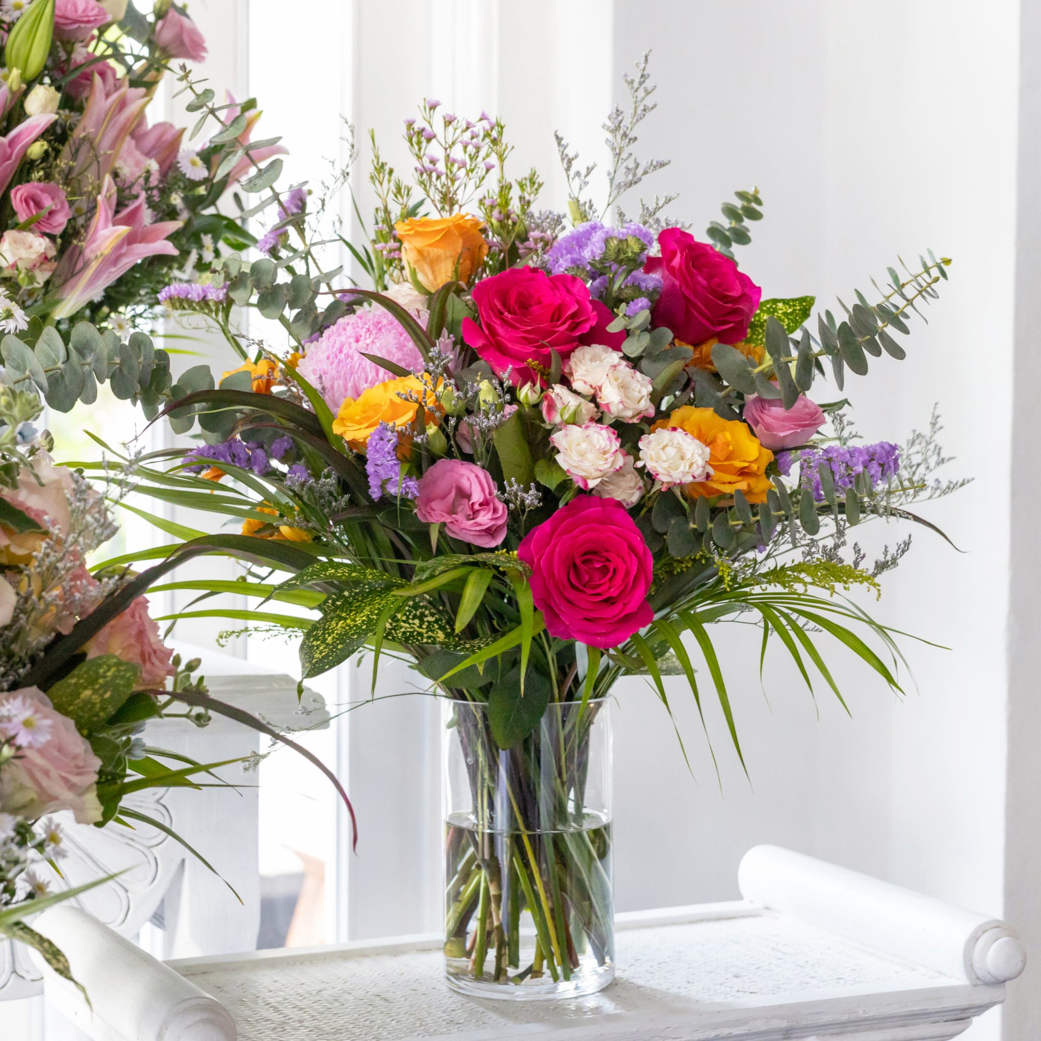 Rosaria features a vibrant mix of hot pink and orange roses, symbolising appreciation, gratitude and recognition. With its bold colours and elegant design, they are a great gift to a friend, partner or family member.