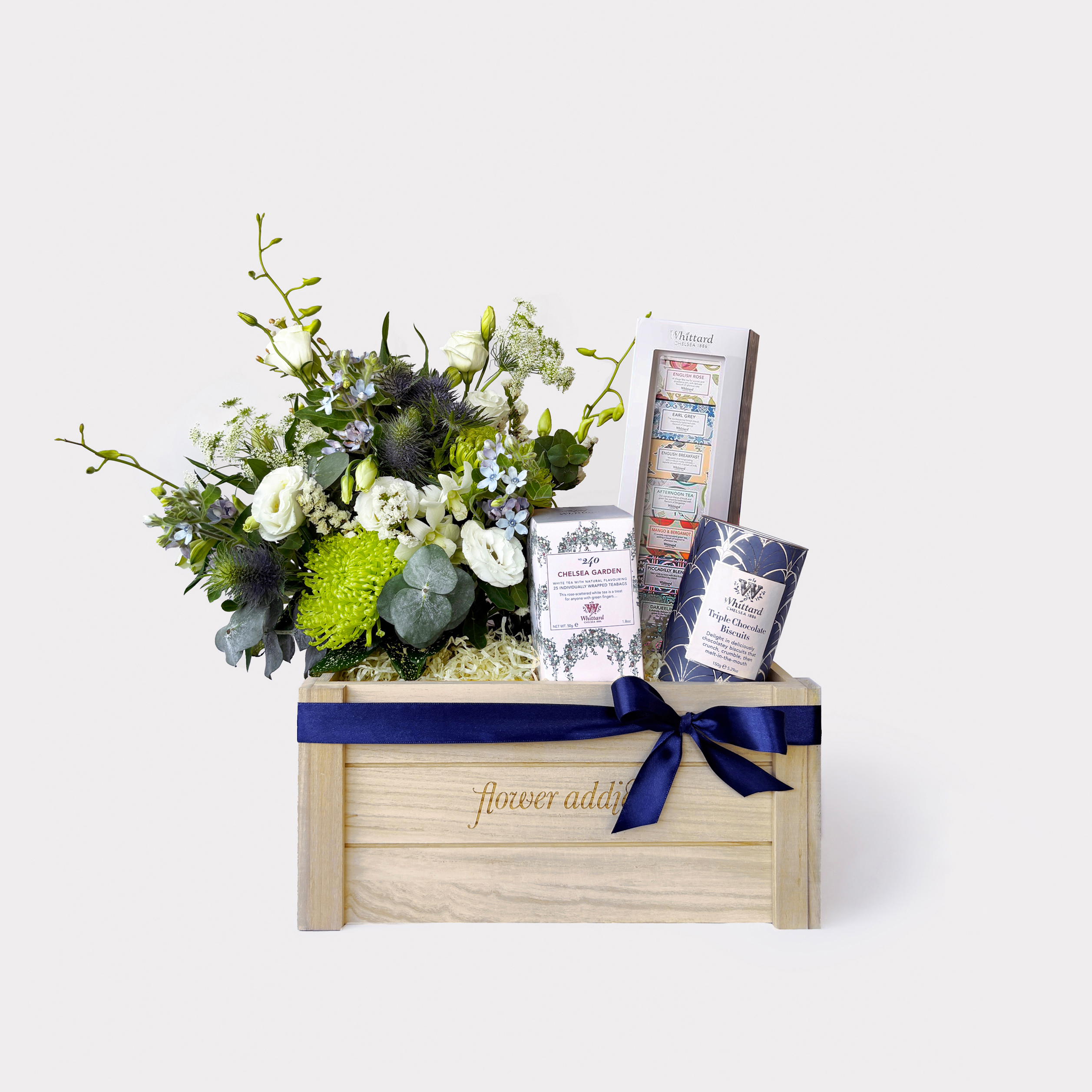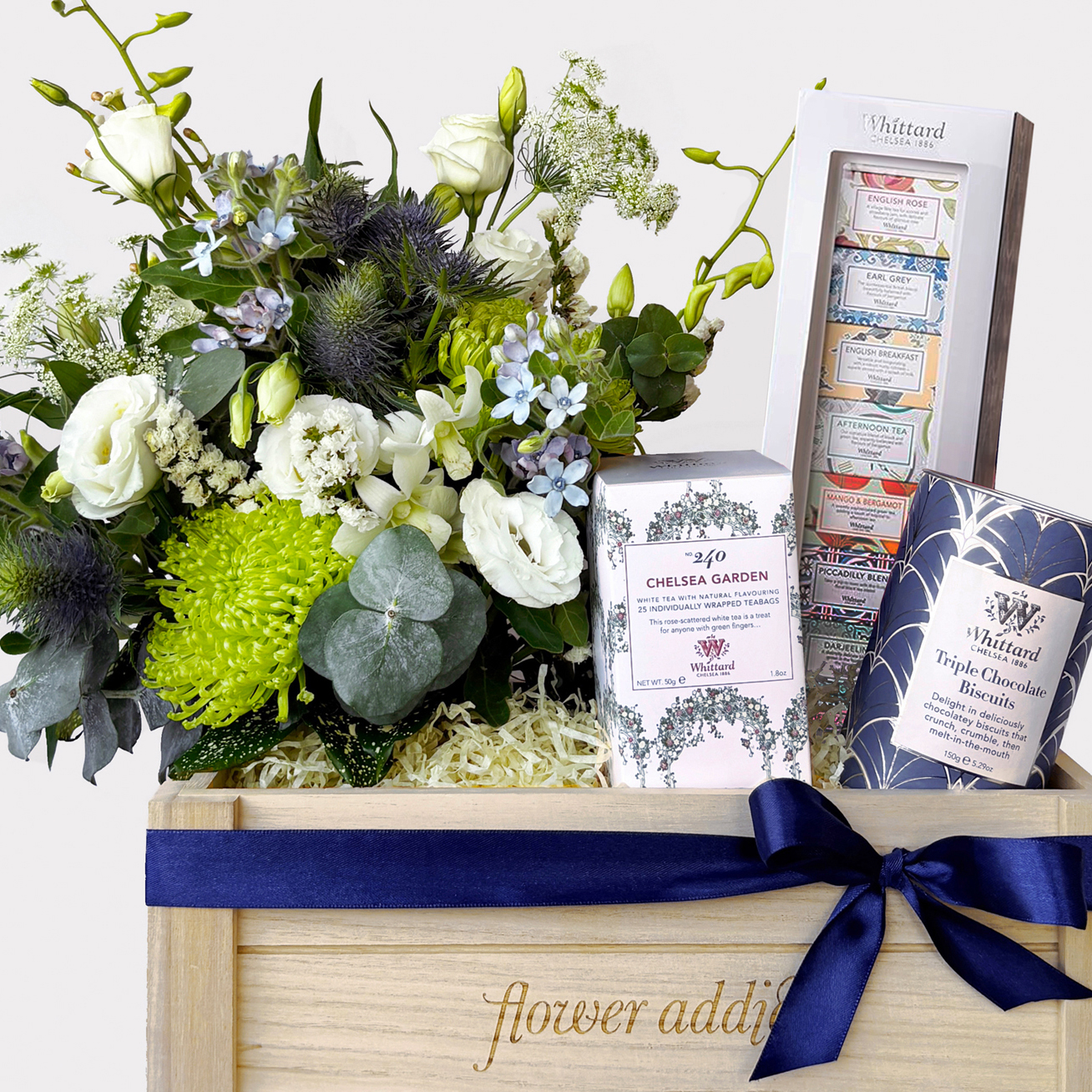 Our Whittard of Chelsea Gift Hamper combines premium teas and indulgent biscuits with a charming arrangement of fresh blue and white flowers, thoughtfully styled to reflect Whittard’s iconic corporate colours. A perfect gift for tea lovers, clients or special occasions.