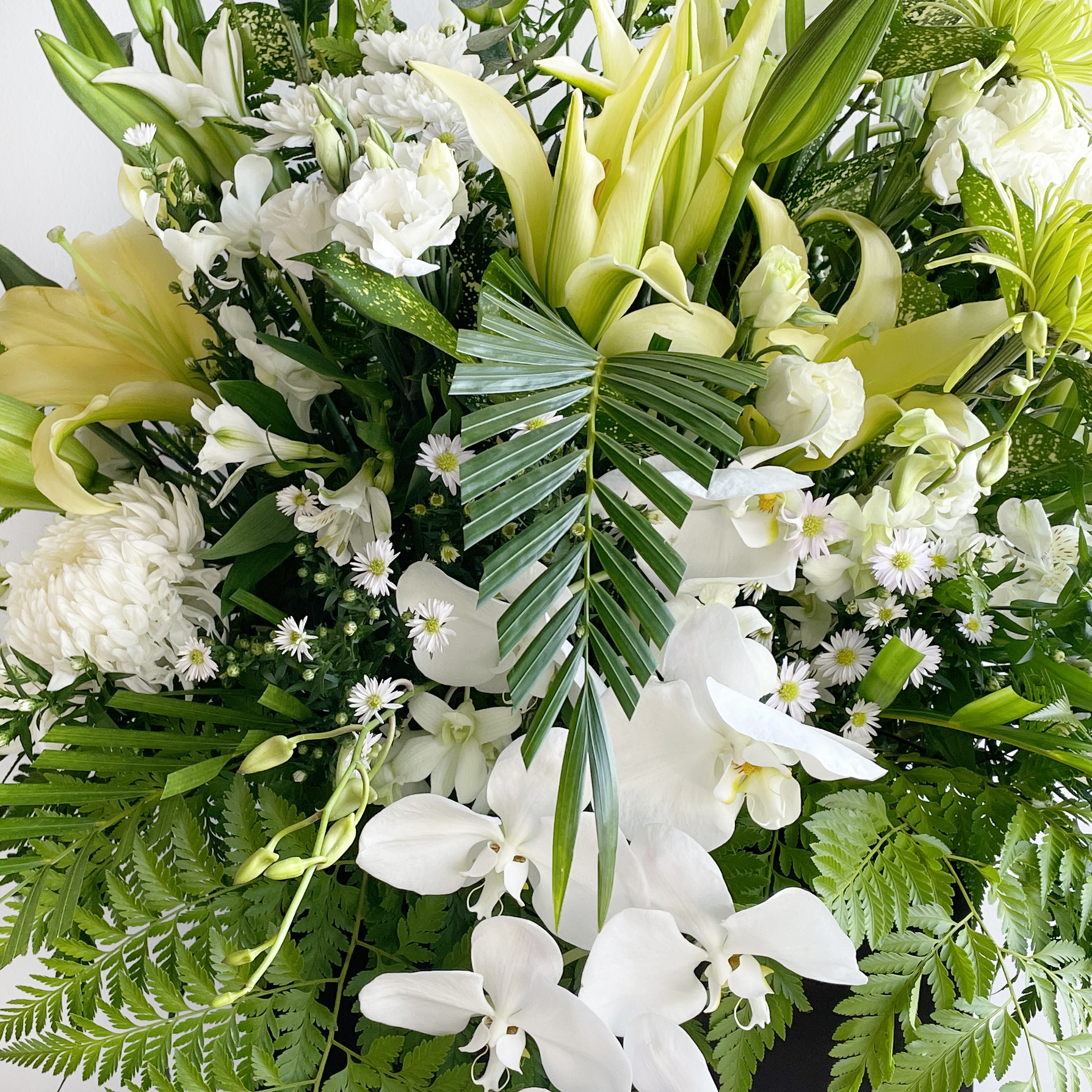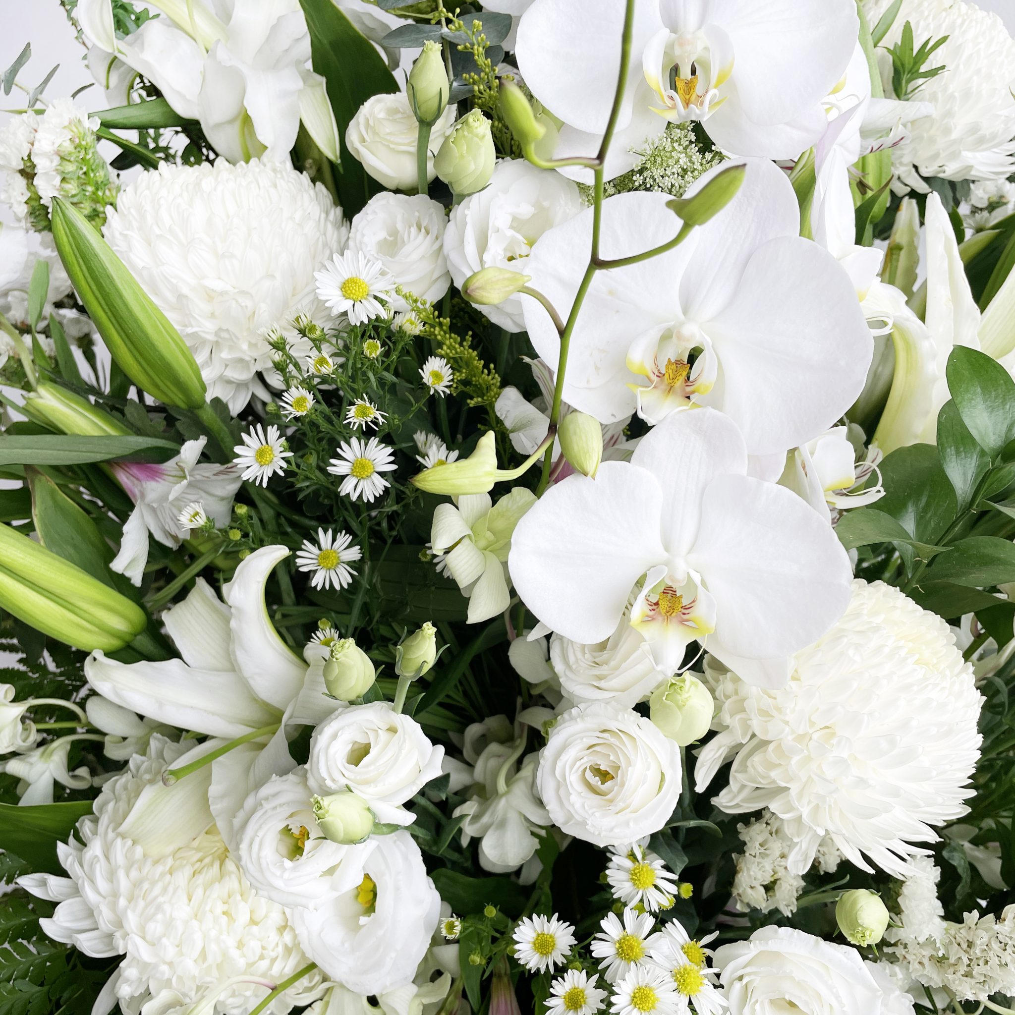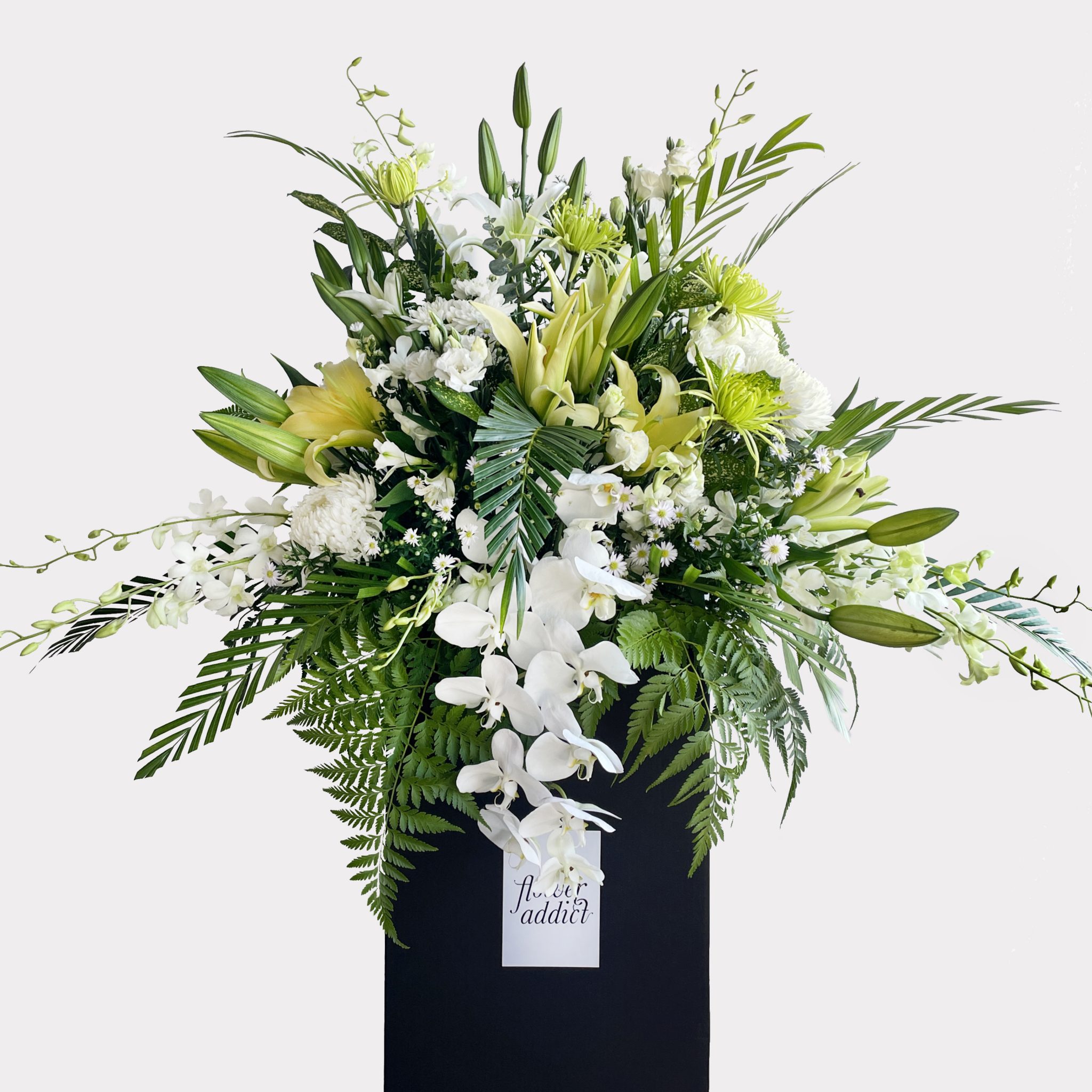 Express your sympathy to a loved one with our graceful, elegant condolence flower stands. Using a fresh selection of white flowers and foliage, this display will convey your sentiments and deepest sympathies.